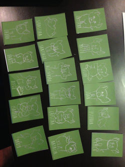 En la actividad de tangibilización, le entregamos a los actores 17 tarjetas diferentes del color que los representa. Al respaldo de las tarjetas los actores debían copiar cuatro características correspondientes a cuatro categorias: Aspecto, personalidad, rendimiento académico, y extras, que les eran dictadas por nosotras. El objetivo de dictar las cualidades era conocer la respuesta de los actores a las características que se pueden ver en las tarjetas a continuación. Posteriormente se le pidió a los actores que ubicaran sus tarjetas en tres tableros (paseo en familia, evento en la ciudad, exposición por bono). se les preguntó: ¿Teniendo en cuenta las características de cada personaje (cerdos) a quién llevarían a cada situación?